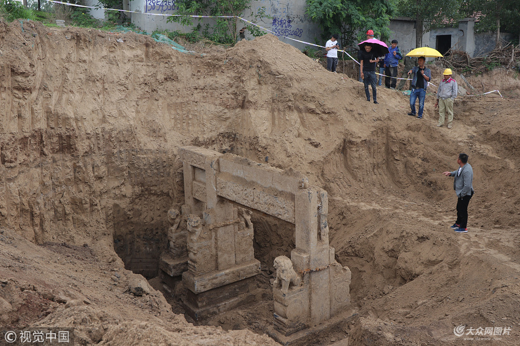 2018年5月21日,山東濱州,村民冒雨在施工現(xiàn)場圍觀剛剛挖出來的貞節(jié)牌坊。