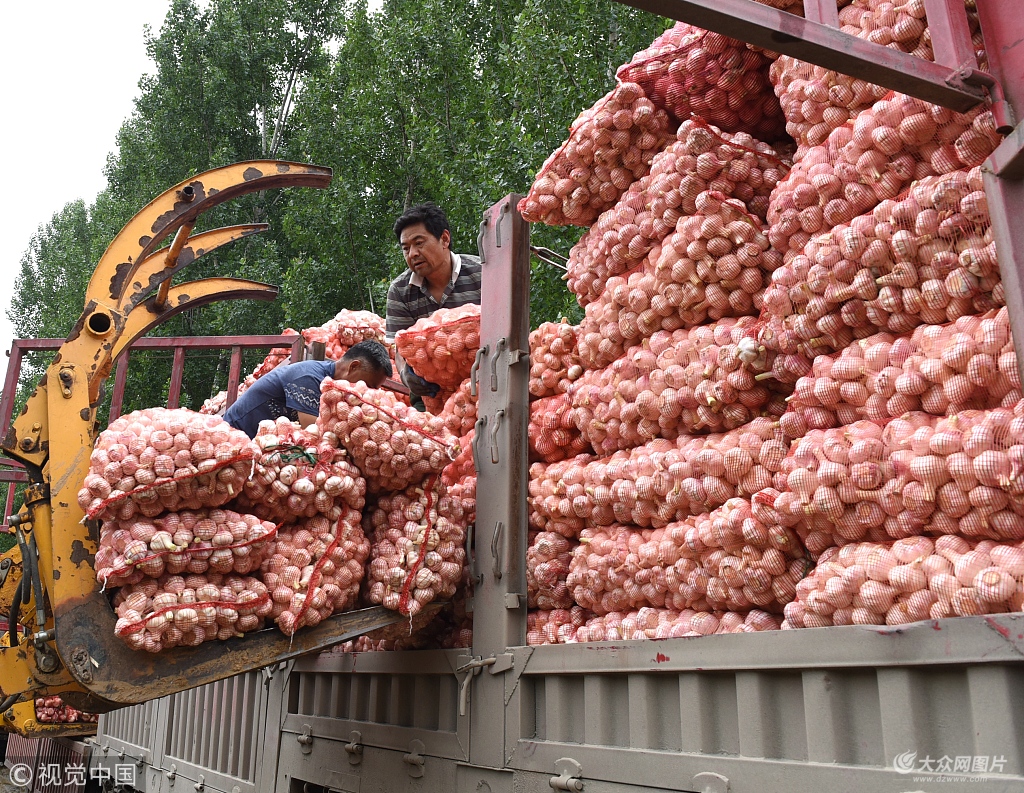 2018年5月21日,山東沂南縣一家腌漬廠工人在搬運大蒜。