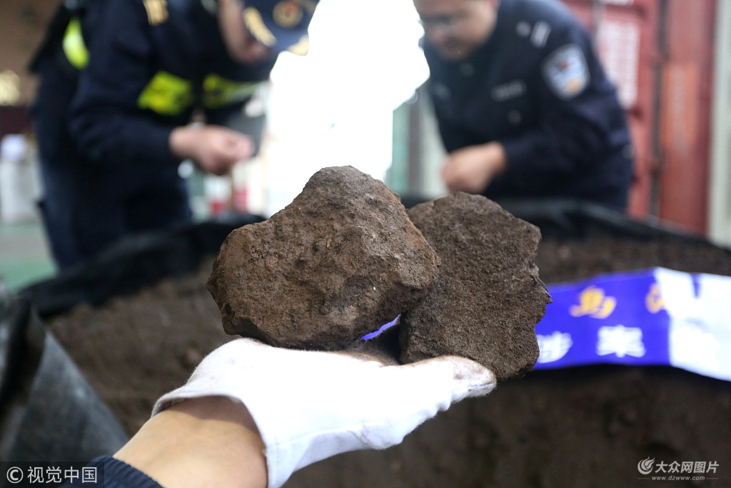 2018年5月22日, 青島海關關員展示查獲走私的固體廢物。