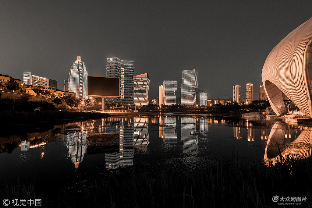 2018年6月2日,青島,為迎接上合峰會,亮化的嶗山區海爾路沿線建筑群,國信體育館、大榮中心在霓虹燈下相互映襯,湖面霓虹燈倒影構成靚麗的風景。拍攝與青島國信體育中心湖邊。