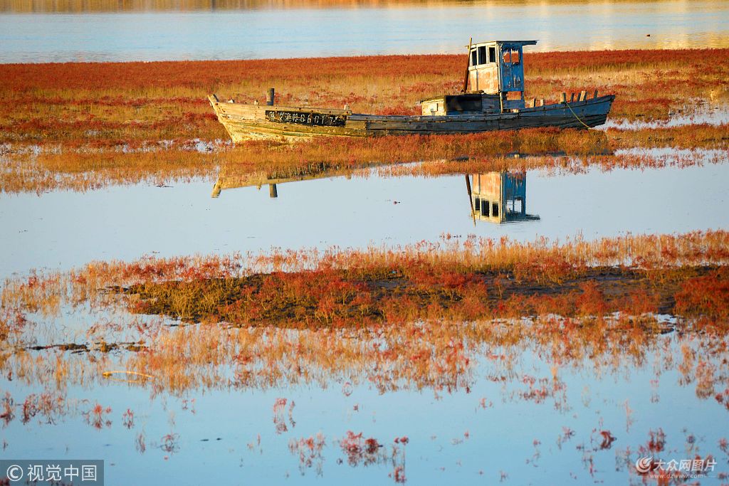 2018年11月22日,青島,西海岸新區紅石崖街道膠州灣入海口成片的堿蓬草進入最佳觀賞季。堿蓬草色澤鮮艷,一簇簇,一蓬蓬,連綿著在海灘上鋪展,十分壯觀,給初冬時節的膠州灣畔編織上了一片片迷人的錦繡,令人驚嘆。