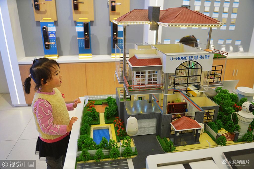 2018年11月24日,一名小朋友在青島海爾智慧家庭城市體驗中心觀看智慧別墅場景模型。