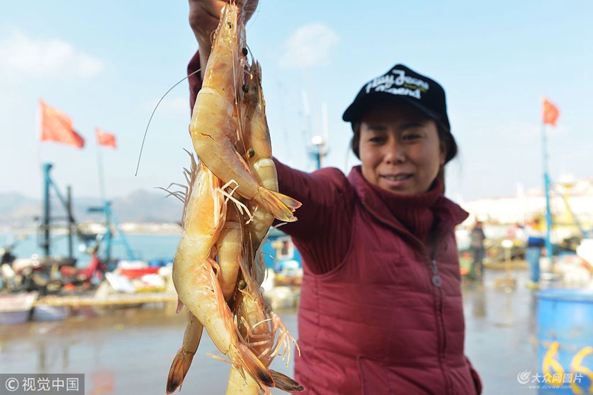 2018年11月26日,在山東省青島市中心漁港批發做批發生意的業主展示新鮮大對蝦。