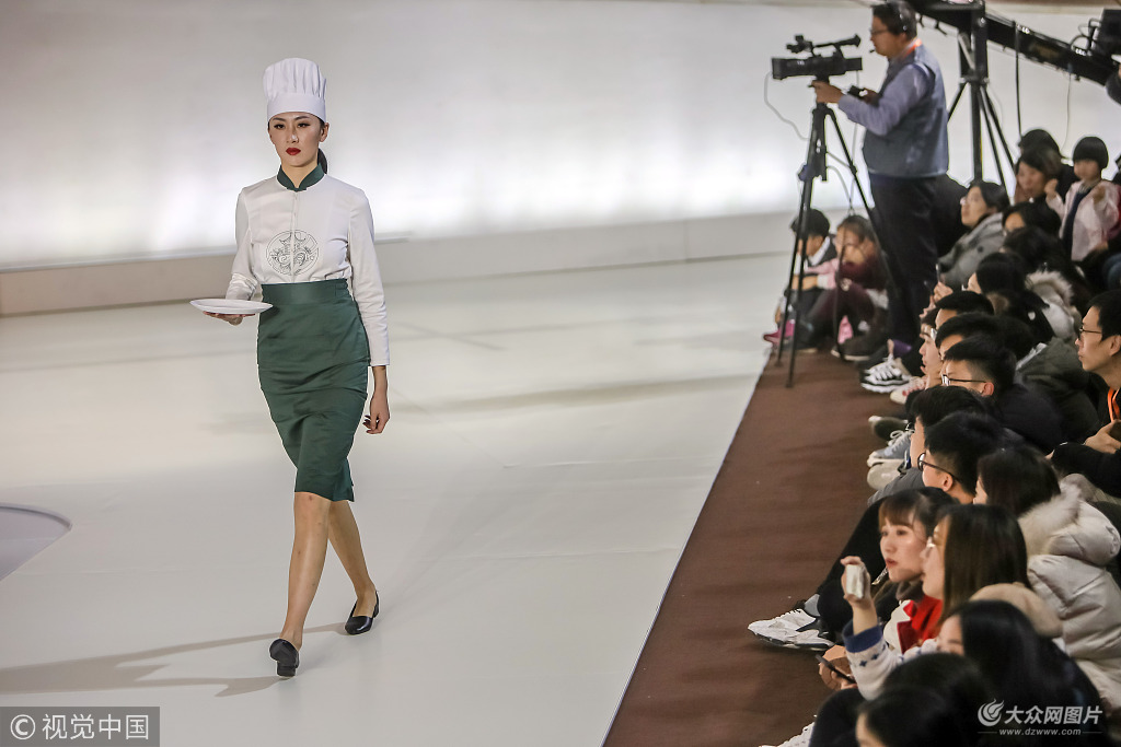 2018年12月3日,濟(jì)南,一場(chǎng)集生活與藝術(shù)、時(shí)尚與應(yīng)用于一體的服飾妝扮展演亮相山東美術(shù)館,由此拉開(kāi)了“為人民而設(shè)計(jì)”——山東工藝美術(shù)學(xué)院藝術(shù)與設(shè)計(jì)作品展的帷幕。模特們裝扮成“大廚”、“服務(wù)員”、“禮儀”等角色穿梭在T臺(tái)上,展示出大學(xué)生對(duì)功能性服裝的設(shè)計(jì)創(chuàng)意。