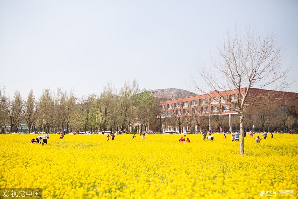 2019年3月31日,濟南,長清區的一所高校內,大片油菜花盛開,金黃色的花朵連成片蔚為壯觀。正值周末,大量市民涌入學校欣賞春景,倘若徜徉在花海之中。
