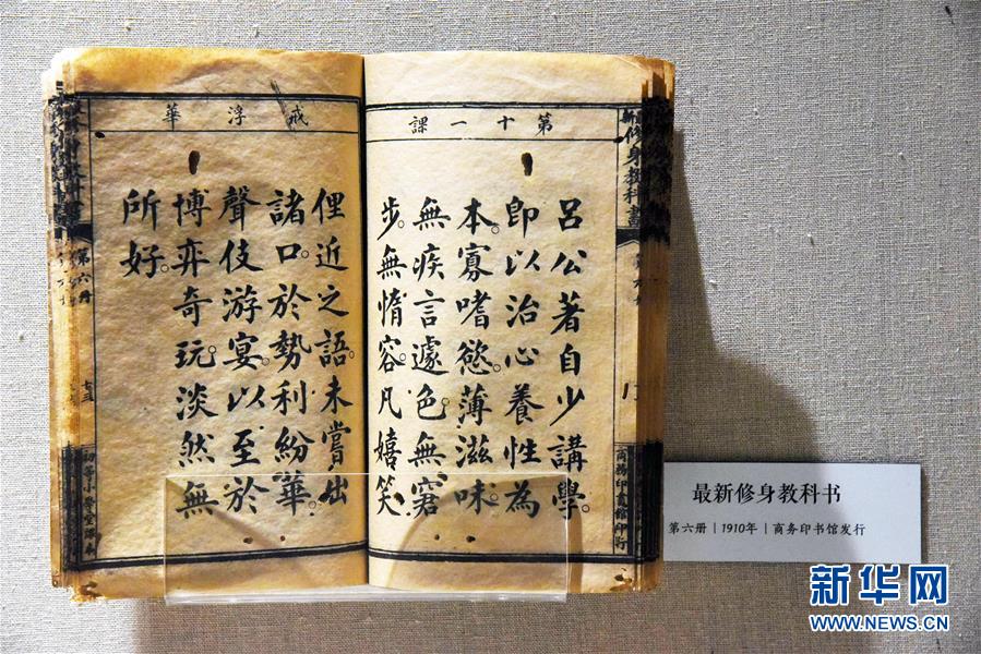 這是1910年商務印書館發行的《最新修身教科書》(4月21日攝)。位于山東淄博市高新區的課本博物館于2016年開館,目前展出2萬余件從清朝至今的課本原件,吸引眾多游客前去參觀。新華社記者 王凱 攝