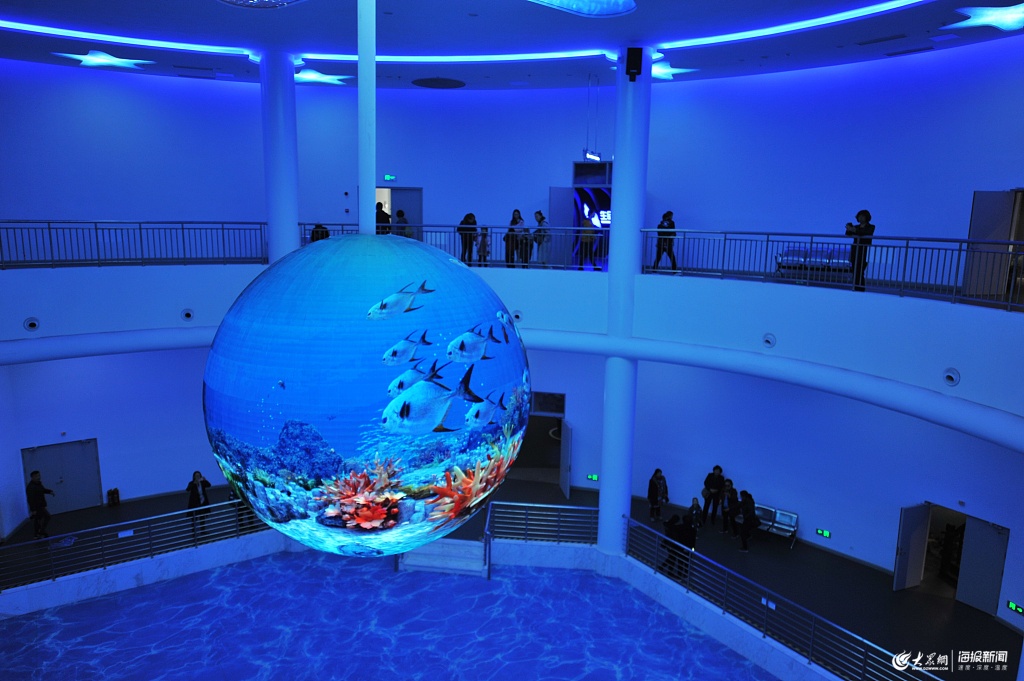 2019年4月28日,游客在日照海洋科普館海底世界立體球展廳參觀。圖片作者:王海濱/視覺中國