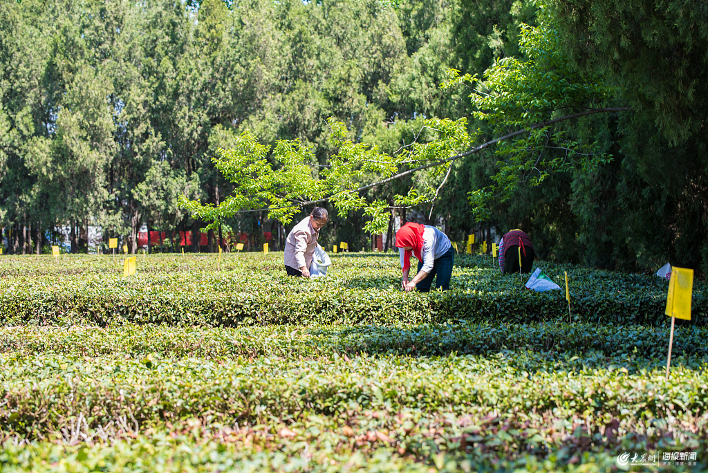 2019年5月1日,山東日照,茶農在采摘鮮葉。