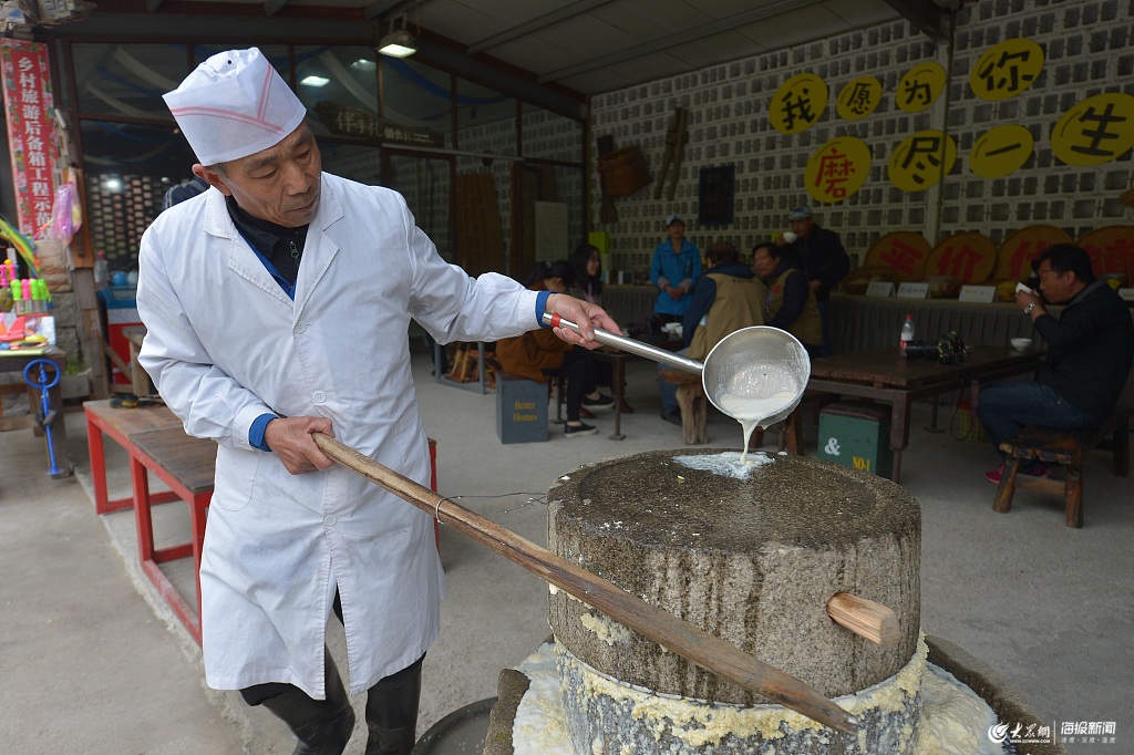 2019年4月28日,山東日照,在大暖帳詩茶小鎮,張華江正在用傳統石磨對泉水浸泡過的豆子進行研磨。