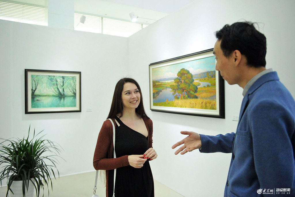 2019年5月4日,青島國際經(jīng)濟(jì)合作區(qū),中俄畫家一起觀看交流油畫藝術(shù)。
