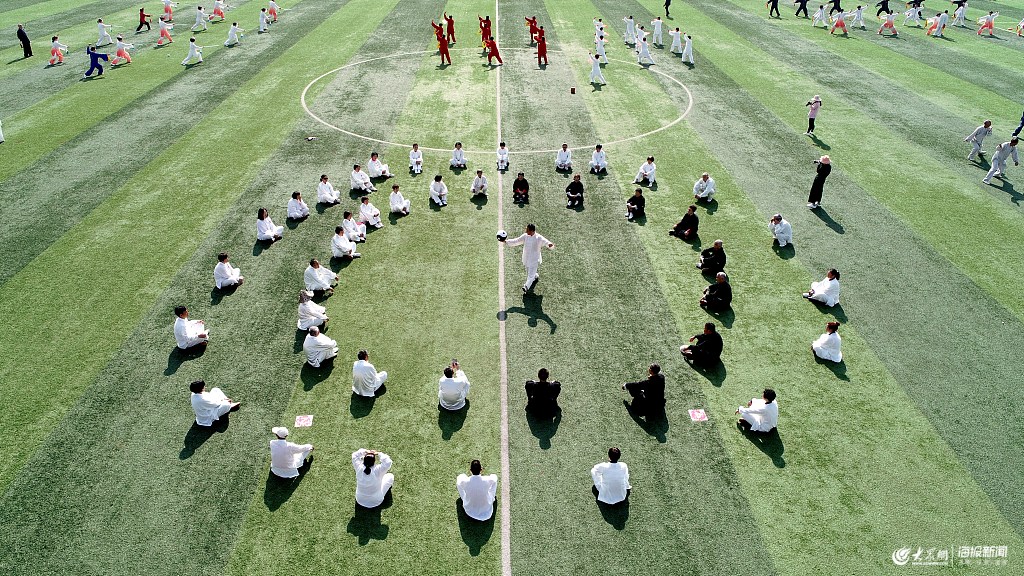 2019年5月9日,太極拳愛好者正在山東省臨沂市郯城縣體育場進行表演(無人機拍攝)。