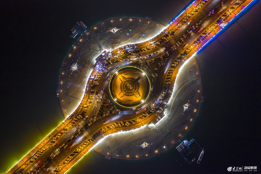 2019年5月3日,山東濱州,“五一節”假期,眾多市民選擇夜游中海公園景區,私家車在中海橋梁和道路兩邊整齊停放,空中鳥瞰,彷如表帶鑲鉆,格外美麗。