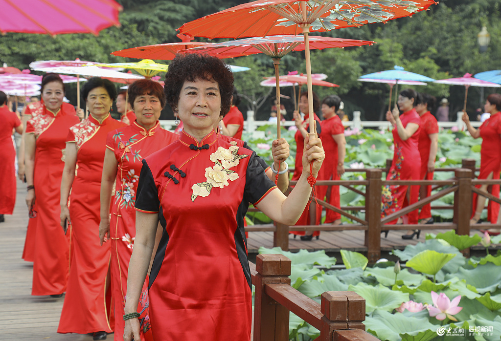 2019年6月30日,山東臨沂,旗袍愛好者在五洲湖公園荷塘參加旗袍秀。多名旗袍愛好者在鮮花盛開的荷塘內走秀,荷塘的恬靜之美與旗袍的優雅之韻相映成趣,為夏日的公園增添了濃濃的的民族文化氣息。