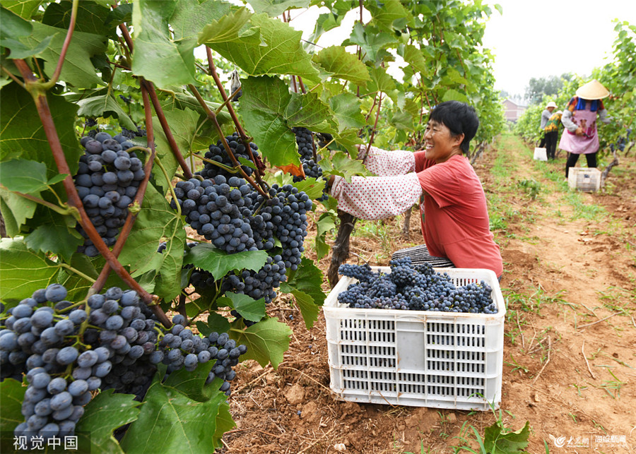 2019年7月24日,山東棗莊,山亭區漢諾莊園葡萄種植基地的工人在收獲歐洲釀酒葡萄。近日,山東省棗莊市山亭區漢諾莊園內百畝歐洲釀酒葡萄喜獲豐收,工人們正抓緊采摘、榨汁,以釀制葡萄酒。