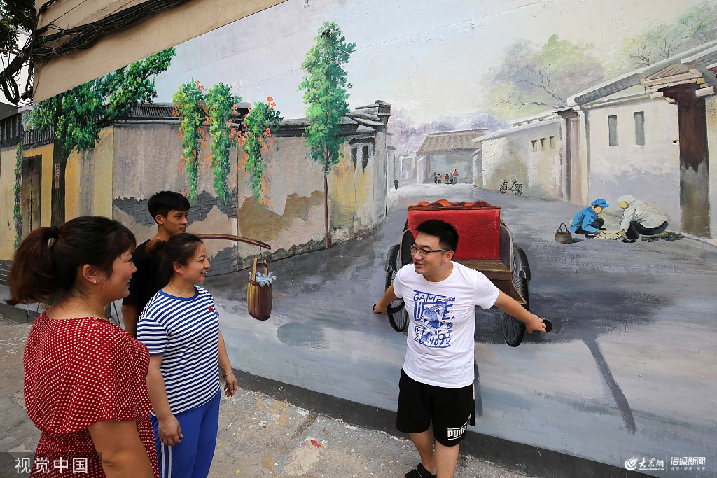 2019年8月1日,山東省濰坊市,立體畫吸引了社區(qū)居民們的目光。日前,山東省濰坊市濰城區(qū)城關(guān)街道濰州社區(qū)在150多米長的街道一旁墻壁上繪制了立體畫,一幅幅反映老城風貌以及卡通動物等內(nèi)容的立體畫映入居民們的眼簾,為社區(qū)增添了新的景象。