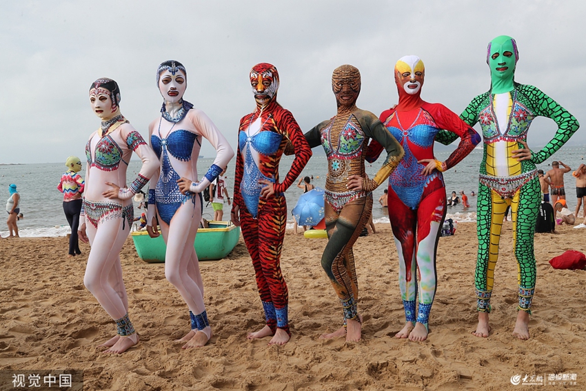 2019年8月5日,青島,臉基尼新產品在第一海水浴場亮相,亮麗的模特與新奇的服飾惹得一些市民及外地游客圍觀。據了解,新品臉基尼仍然使用冰絲、尼龍等面料,只在圖案上做了一些變化,將女性乳罩作為主要裝飾圖案,設計搭配在圖案紋樣中,更加突出了女性的優美特點。