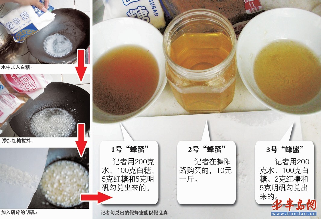近日,國內不少媒體曝光了“假蜂蜜”事件,讓一些愛喝蜂蜜的市民心里不禁打鼓。近期,在島城街頭,也有很多商販挑著蜂蜜叫賣,自稱是“天然蜂蜜”。這些蜂蜜到底是真是假?業內人士向記者透露,其中不乏假蜂蜜。24日,在業內人士的指導下,記者利用水、白糖、紅糖、明礬等原料,操作10分鐘就制作出了形可亂真的“蜂蜜”,這種“蜂蜜”成本每斤才5元錢。