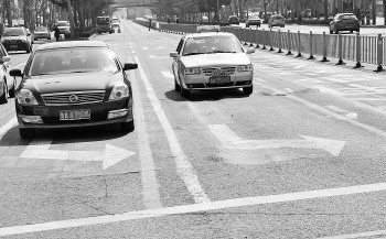 和平路南口南向北方向增設(shè)一排左轉(zhuǎn)車道,是在拆除兩道BRT護(hù)欄和原有車道“瘦身”的基礎(chǔ)上進(jìn)行的。現(xiàn)有的BRT護(hù)欄只有一道,而且底座寬20厘米左右;而原先的兩道BRT護(hù)欄,每道護(hù)欄的水泥墩寬約50厘米,再加上實(shí)線,兩道護(hù)欄占用1米多的寬度。