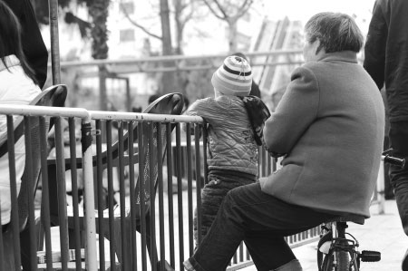 孫子看著游樂園很雀躍,老人背影孤單