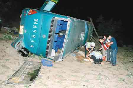 [提要] 昨晚8點40分,一輛載有38名大學生的大巴車行駛至210國道秦嶺段青崗樹村時,突然沖向馬路東側,翻入十多米的溝底,造成一名學生當場死亡,其余學生不同程度受傷。事故原因初步判斷為剎車失靈。