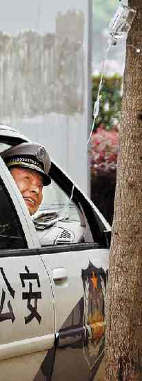 6月13日上午9時(shí)許,在武漢市青山友誼大道三弓路路口,一輛編號(hào)為8615的警車(chē)停在路邊,小樹(shù)上懸掛著吊瓶,長(zhǎng)長(zhǎng)的輸液管拖下來(lái),延伸到一旁的車(chē)窗內(nèi),一名交警正坐在警車(chē)內(nèi)輸液。
