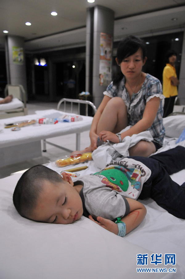 7月24日凌晨,在溫州市康寧醫院內,一位乘坐D301次列車的乘客望著病床上熟睡的孩子。新華社記者 鞠煥宗 攝