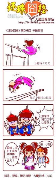 隨著新《還珠格格》的熱播,各種找茬、戲說(shuō)、惡搞不斷。近日,由“大蕾動(dòng)漫”創(chuàng)作的一系列的以新《還珠》為主題的惡搞漫畫(huà)《還珠囧格》爆紅網(wǎng)絡(luò),發(fā)布在某著名論壇之后,短短幾天內(nèi)引起了近20萬(wàn)人的圍觀,微博上更是追捧者無(wú)數(shù)。