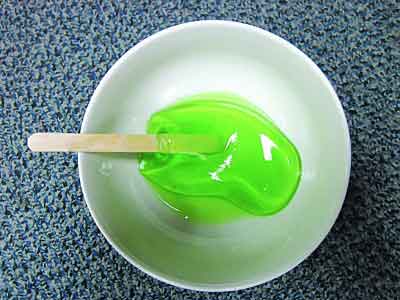 記者做了個實驗:將一支拆開了包裝的“綠舌頭”放在碗中,讓其慢慢融化。和一般雪糕融化成液體不一樣的是,一個小時之后,原本堅硬的“綠舌頭”變成了一塊軟軟的、粘滑的膠狀物,有點像果凍卻不易被攪碎,碗底還有少量的淡綠色的液體,記者湊近了,能聞到濃郁的香精香氣。不過,從配料表來看,這款“綠舌頭”的食品添加劑并不算多,僅有檸檬酸、增稠劑、食用香精、檸檬酸鈉、焦糖色、檸檬黃、亮藍7種,遠低于市場上其他“花哨” 的雪糕添加劑含量。