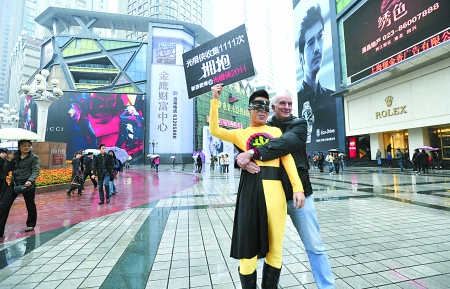 "光棍俠"雨中現重慶解放碑 求1111個擁抱