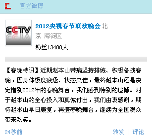 微博原文:【春晚特訊】近期趙本山帶病堅持排練、積極備戰(zhàn)春晚,因身體極度疲憊、狀態(tài)欠佳,最終趙本山還是決定惜別2012年的春晚舞臺,我們感到特別的遺憾。對于趙本山的全心投入和真誠付出,我們由衷感謝,期待趙本山早日康復,再登春晚舞臺,繼續(xù)為全國觀眾帶來歡笑。