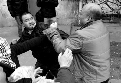 2月8日,張妙的丈夫王輝(左)揮起拳頭砸向藥慶衛(wèi)的代理人馬延明(右)。