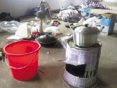 汪曉旭走到三樓一瞧,只見上面放著鍋碗飄盆,一床被子,一大袋掛面,還有一個廢棄的油漆桶。油漆桶桶身和桶底各挖了一個洞,被改造成了爐子。