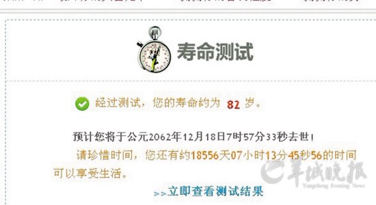 [提要] 27日,一條“一個壽命測試的微博應(yīng)用”被眾多網(wǎng)友測試并擴散,看到七八十歲的測試結(jié)果,多數(shù)網(wǎng)友嘆七八十歲的壽命太驚恐。27日,羊城晚記者聯(lián)系該微博應(yīng)用平臺后臺人士,該人士稱,根據(jù)美國科學(xué)家的研究結(jié)論做的,僅供參考。而對于記者所追問的哪位科學(xué)家,該人士則不予回答。