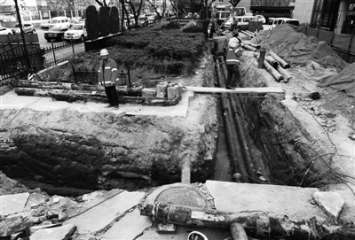 [提要] 昨日,事發現場,搶修人員挖出滲水管道。昨日,在事故現場,工作人員已經確定了滲漏管線位于物華大廈熱力支管。一名現場施工人員介紹,滲漏點在支管上,他們已將長約30米的支管切割下來,正在更換全新管線。