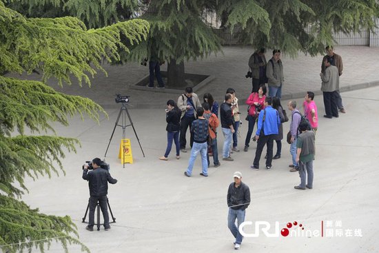 2012年4月27日,陜西省富平監獄外,在門外等待周正龍出獄的多家媒體均未能見到周正龍。當日,因假老虎事件而坐牢的周正龍出獄。 國際在線圖