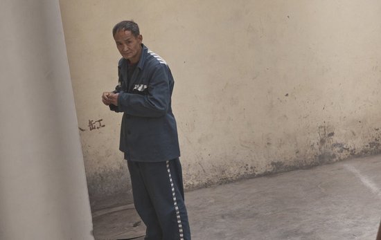 2011年4月21日,陜西安康,周正龍在監室外的一個角落里抽煙。監獄方面稱,之所以派出警車送周回家,是考慮其年齡較大,屬于需要關照的重點犯人,必須送到鎮平縣司法局辦理移交手續,實現“無縫對接”。國際在線 圖
