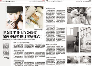 [提要] 昨天,美女歌手娜娜(化名)家人致電本報(bào),稱發(fā)現(xiàn)重要案情,娜娜跳樓前曾遭到多人強(qiáng)暴……就在前天,他們在給娜娜擦洗身體的時(shí)候,發(fā)現(xiàn)娜娜的下身青紫腫大,根據(jù)醫(yī)生的判斷,有可能遭到多人暴力性侵。