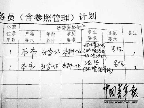 長治市環保局遞交的"2011年度錄用公務員(含參照管理)計劃"顯示,宋江明所報考的"科員2"職位的"專業要求"是"法學(環境資源法)","其他要求"是"男性"。本報記者來揚攝