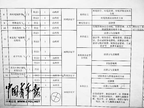 對外公布的"長治市行政機關2011年考錄公務員(含參照管理)職位表"上,該職位的專業要求變成了"環境資源法及相關專業","其他要求"則變為空白。本報記者來揚攝
