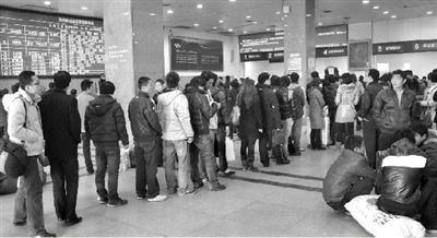 昨天,在鄭州火車站售票大廳內,購票的旅客們排起了長隊。
