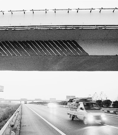 12月4日,記者與相關專家沿劉江立交橋縱橫兩個方向進行了實地勘察,發現河南漯河市境內的京港澳高速與寧洛高速立交橋、許昌市境內的京港澳高速與蘭南高速立交橋、開封市境內的連霍高速與大廣高速立交橋、通許縣境內的大廣高速與蘭南高速立交橋、扶溝縣境內的永登高速與大廣高速立交橋、周口市境內的商周高速與大廣高速立交橋、寧洛高速與商周高速立交橋7座大橋,均無鋼板加固措施。