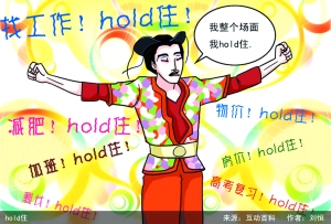 網(wǎng)上流傳一位女嘉賓以夸張的造型、做作的英語、扭捏的姿態(tài)介紹什么是“Fashion(意為時尚)”的視頻,她的口頭禪是“整個場面我要Hold住”。“hold住”一詞由此紅遍網(wǎng)絡(luò)。網(wǎng)友們豐富了“hold住”的含義:面對各種狀況都要控制、把持住,充滿自信地從容應(yīng)對。