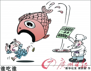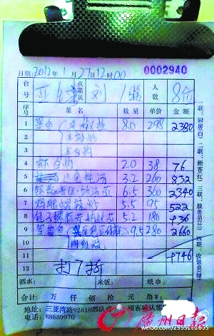 1月28日,北京某房地產服務機構董事長羅迪在微博稱:“朋友一家三口前天在三亞吃海鮮,3個普通的菜被宰近4000元。鄰座一哥們指著池里一條大魚,剛問價,店家即將魚摔暈,一稱11斤,每斤580元共6000多元。那哥們剛想說理,出來幾個東北大漢,只好收聲認栽。”該微博獲3萬多條轉發。