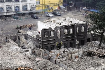 14日,記者趕到位于重慶市渝中區(qū)解放路的行營舊址進行現(xiàn)場采訪。記者看到,“重慶行營”已成施工現(xiàn)場,工地周圍修起了圍墻,有鐵門一扇可供進出,兩樓一底的舊址屋頂已經(jīng)完全被拆掉,僅剩磚木殘體。現(xiàn)場有不少工人正在施工,搬運磚塊、木條。記者在施工現(xiàn)場圍墻上未發(fā)現(xiàn)有文物保護性修葺的公告。