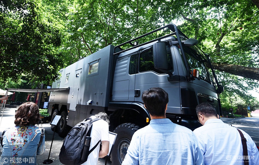 2018年5月9日,在杭州西湖邊的道路上拍攝到的豪華越野房車。 近日,一輛超級豪華越野房車亮相杭州西湖邊,其令人吃驚的銷售價格吸引了不少路過的市民前來觀看。