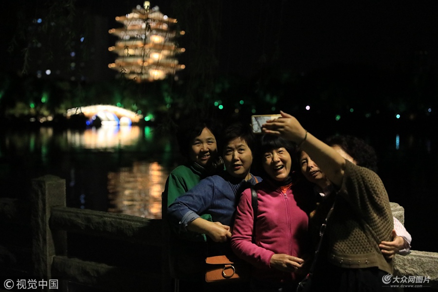 2018年5月23日,濟南,大明湖景區燈光璀璨美不勝收,吸引市民爭相合影留念。