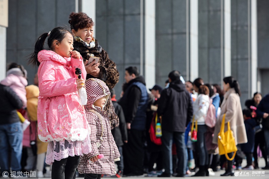 2019年2月17日,濟南,開學臨近,山東博物館門前排起長隊,停車場也是滿滿當當,眾多家長帶著孩子利用寒假尾聲來到省博,在展覽中感受國寶與中國文化的魅力。