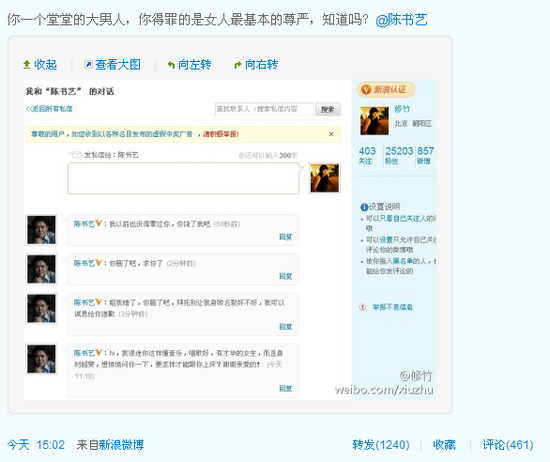 27日,新浪微博上一張私信截圖被大量轉發。“你一個堂堂的大男人,你得罪的是女人最基本的尊嚴,知道嗎?”微博用戶“修竹”在下午15:02發出微博,微博中,“修竹”發布了一張私信對話截圖,“Hi,我很迷你這樣懂音樂,唱歌好,有才華的女生,而且身材超贊,想悄悄問一下,怎樣才能和你上床?謝謝親愛的!眱热菔俏⒉┯脩簟瓣悤嚒卑l給她的私信內容。截圖還顯示,“陳書藝”之后連續發了3封私信,懇求“修竹”刪除該內容,并稱可以誠懇的給“修竹”道歉,只求別讓其身敗名裂。對話雙方都是通過新浪官方身份驗證的加V用戶。