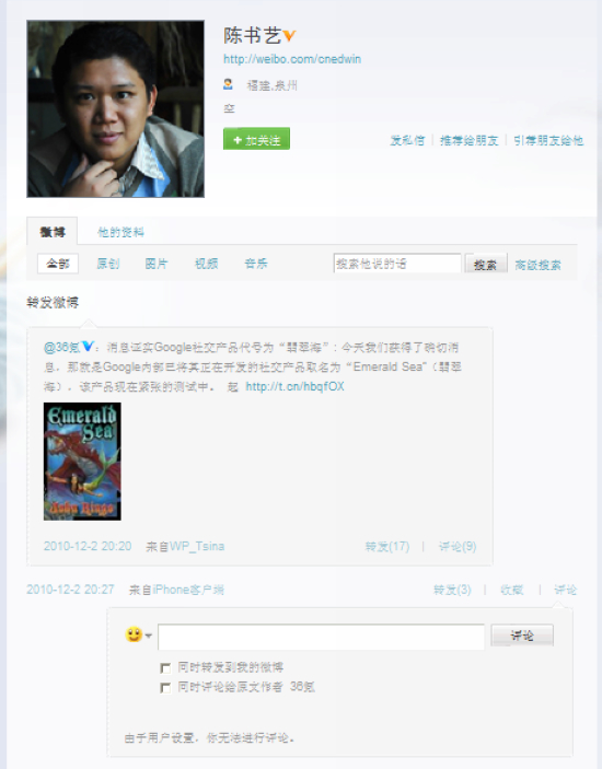 陳書藝新浪認證微博發現,內容被大量刪除,連評論功能也被關閉。