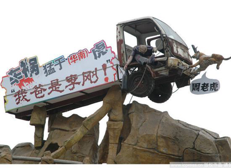 2010年10月29日,重慶,一個《車禍猛于華南虎“我爸是李剛”!》的實景道具行為藝術肅立在重慶市南岸區洋人街。